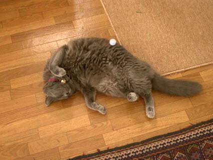 寿珠が別の部屋で昼寝してたりして、 どこにいるんだろうなんて話していると、 目が覚めて、撫でて欲しくて、無理にわれわれのそばを通り過ぎる。 撫でただけで話題にしないでいると、 寿珠のことも忘れないでってみゃぁと鳴き、 我々が話の途中に「寿珠」って入れると満足そうに尻尾の先を左右に振りながら別の部屋に出て行く。 私が炊事をしている時などは、 足元で寝転がっているので、 足がぶつかったり、 尻尾を踏まれたりするのだが、それでも毎回くっついて寝転がるのだ。