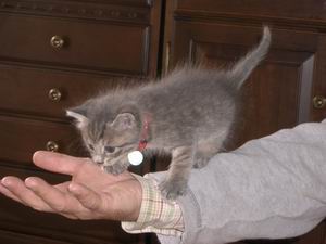 仔猫が家にきた。 私の飼っている寿珠を見て、 飼いたいと言った東京の友達に渡すまでの約ひと月間、 私が飼うことになったのだ。 というのも、 今日でまだ350グラムでようやく生後 ひと月といったところでとても手が掛かる状態。 働いていて忙しい友人家族には無理だろうと、 私がしばしの母親役なのだ。 母猫の元から引き離してきた4日の夕方には、 ぺっ!ぺっ!って威嚇していた仔猫も、 ミルクをほ乳瓶でやると少し落ち着き、 鳴きすぎて目ヤニで開かなくなった目をホウ酸でひたした綿で開くようにしてあげるとさらに落ち着いたのか、 疲れたのか、 朝まで眠った。 翌朝お腹がすいたよぉ~っていう大きな鳴き声に目を覚まされ、 ミルクの後、 シャワーで躰を洗ってやると、気持ちよさそうにじ~~~と湯を掛けられていた。 乾かす頃には、 膝の周りでちょろちょろ遊び回りゴロゴロとのどを鳴らしてお腹を出してころころするほどになって、 ようやく ひと安心。 今では、 鳴き声が聞こえたらバスケットから出し、ミルクを飲ませる。 暫くすると遊びはじめ、またミルクを飲んで遊ぶ。 そんなことを繰り返すうちに、 三日目には覚えたトイレで用を足し、また遊んでから私の腕の中で眠り始めるのでバスケットに移す。 そんなことを日に五回ほども繰り返している。 仔猫は福ちゃんと名付けられた。 どうやら男の子らしい。 道理で寿珠の声とは大きさが違うし、随分やんちゃ(^_^;) 体色は背中はグレー、 顔とおなかや脚はグレーとベージュの縞々。 寿珠とみゅうみゅうを掛け合わせたような色合い。 毛質は寿珠と同じふかふかとした長毛ぎみで、 顔つきや手のかたちはみゅうみゅう。 (寿珠とみゅうみゅうの赤ちゃんの頃の画像はこちらから ) 今年のゴールデンウィークは、 前半は韓国からのお客様と、後半からは仔猫と過ごすいつになくあわただしいものでした。 生後1ヶ月足らずの福ちゃん。 この後、福ちゃんがぺっって威嚇し、 寿珠は全力疾走で逃げました(^^;)