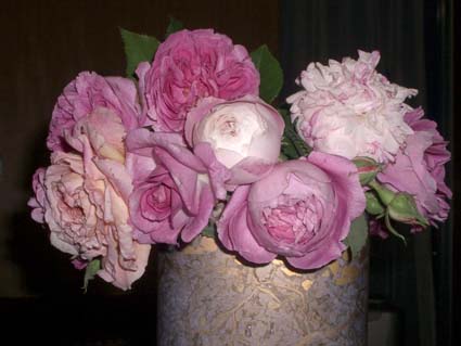 今朝、会う度に薔薇の話で盛り上がってしまう元生徒さん(今は手首が痛くてお休み中)から、庭に咲いたという薔薇をいただいた。 ブルボン系のオールド・ローズが好きな彼女らしく、 花びらの枚数がとても多くて、優しい雰囲気の薔薇がほとんど。 今、わたくしの部屋には、オールドローズ独特の濃厚な香りが漂っています。 上のほうには青みを帯びたローズピンクのルイス・オーディエ、 白にピンクの絞り咲きバエリガータ・ディ・ボローニヤ、 ころんと丸いピンクのがラ・レーヌ・ビクトリア、 同じ花形で白く周りの花びらだけピンク色のマダム・ピエール・オジェ、 杏色のはアブラハム・ダービー、 花びらが少なめで 花芯が黄色いブルボン・クイーンは右のほうで横を向いててよく見えないね。 それから、中央左の 高芯の薔薇は名前がわからないなぁ。 写真を見ると、 ウィーンで買った花瓶とあいまって、 さらに豪華。 でも、こんなにたくさんの薔薇が咲いているなんてびっくり。 うちの庭は、今年はなんだか花がとても遅いの。 咲いているのはわずかにルイ・フィリップとれんげローズのみ。 他のは、まだまだ蕾が 固そうです。