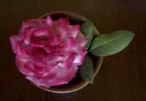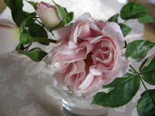 今年は庭のバラが思いのほかたくさん花をつけた。中でも殊の外美しかったのはロサ・フェアシューレン。葉が斑入りで珍しいだけでなく、グレーがかったピンクは何ともいえない大人びた色合いで、 花びらの枚数は少なめなのだけれど、 花が開いてしまう前に芯が4つに分かれて渦巻く。 そうして開くとフリルのように波打つ。 開くといっても筒咲きのまま数日保った後に、ひらひらと散るのだ。 名前にロサが付くの古い年代の作出なのでしょうが、 その割りにおおぶりでたっぷりとした、優雅でそして退廃的な雰囲気の薔薇だ
