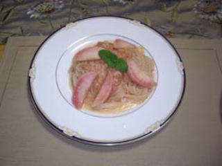 カダイフは教室で以前に使った素材。天使の髪の毛っていう意味の細くて柔らかい麺状のもので、パン粉代わりに巻き付けてソテーしたり、揚げたりします。 さくっとした中にふっくらとしたまとう鯛が美味しいのでですが、肝心なのは、ソースの置き方。 魚のの下に隠してレモンのしっかり効いた甘酸っぱいソース。見えるところには緑鮮やかな色を魅せるだけのソースを飾っていました。 緑に惹かれてこれは何の味?何からくる香り?って思わせるけど、 味と香りは魚の下に隠したソースからという新鮮な一品でした。
