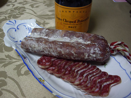 フランスのおみやげにサラミを頂きました。赤と白の紐がおしゃれね。