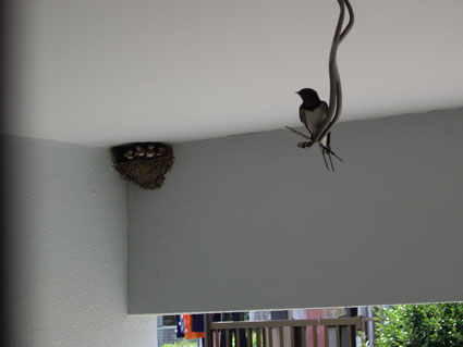 ツバメが巣立ちの日を迎えている。 狭くなって、5羽いるのに、こちらを向けるのは4羽だけ。このところ、親が飛び立つよううながしている。