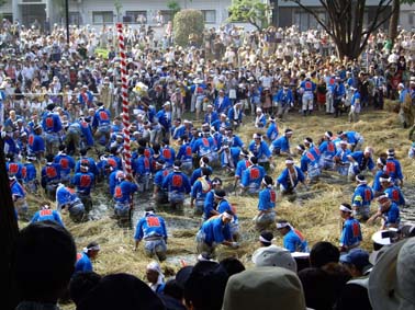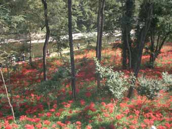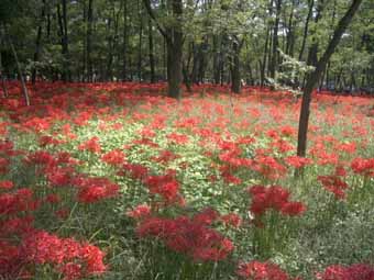 高麗川の巾着田に行った。 曼珠沙華で有名なところ。 近づくにつれ車は渋滞し、臨時駐車場は車で溢れていた。これだけの人混みの中で花を見たってなぁとあまり期待もせずに行ったのだが、 これが大間違い。 吊り橋を渡ろうとした時、眼下に清流とその向こうに赤い広がった。曼珠沙華だ。 林には縦横に小道が走り、もちろんが人が大勢いるのだが、そんな事も気にならない位の広さの林。 さわやかな風が通る武蔵野の林。(関西にはあんな林はないね。 10メートル程の高さまで枝も広げずにすっと伸び、その先に広葉樹の葉が茂っていて、下草は膝にも満たない。その空間にはさわやかな空気が漂っている。高校生の頃に読んだ小説なんかでは、よく「武蔵野を彷徨い歩く」なんて場面が良く出てきたが、埼玉に来てからようやく納得。 だって、関西のは繁みっていう濃密な感じで、足を踏み入れる余地はないでしょう。) その林の片側を流れる高麗川の清流の浅瀬では子供が水遊びをし、河原ではお弁当を。林の足元には広がるいちめんの曼珠沙華。見上げる高さには緑の葉が、そこから空が透けて見える。横にも縦にも層をなす風景。いつまでもそこに居たいような静かな空間。ちょっと変だね。 人がいっぱいの観光地なのにね。 曼珠沙華を見る前に高麗川マロンを買いに行った。 栗の木の真ん中の枝を切って、陽当たりが良いように剪定することで大きく甘い栗を作っているらしい。市内三カ所の直売所があるそうだが午前中には売り切れるとのこと。さもありなんという程の大粒で、その上収穫のあと薫蒸しているから虫がついていない。 利平栗と大峰栗があったので両方購入。利平栗は有名なだけあって、黄色くほくほくと甘い。大峰栗は山栗に近いという説明通り、大きさは利平と同じくらいあるのだが、しっかりした歯ごたえと味だった。 帰りには高麗神社まで散策。 高句麗が唐と百済に滅ぼされた時に海を渡って来た人々の末裔が住む村にある神社だ。 私の友人のルーツもその村にあるという。 李王朝の方々はもちろん、 韓国の総領事、我が国の総理大臣、検察庁長官など、出世の神様というだけでは説明できないほどの錚々たる人たちが寄進しているのには驚かされる。 とにかく、後ろに控える山にむけて幽栖門という名の門が建つ、なんだか不思議な気配の神社でした。