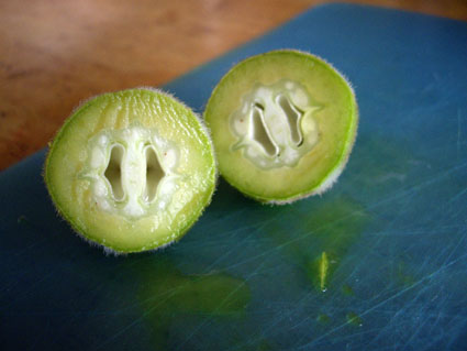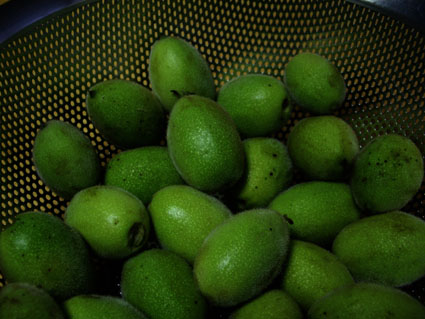 山胡桃の大木に実がたわわに成っていた。 大きく膨らんでいるけれど、青く未熟だ。 丁度良いくらい! 少し頂いた。