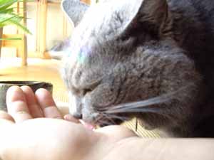 おなかが空くとまたまたみゃぁと鳴いて、「フードを食べさせて」ってせがむ。 そこまではよその猫と同じなのだが、 留守勝ちにしたり、 あんまりかまってあげなかった日には、お皿にフードを入れると、私の手に頭をこすりつけて、「掌から食べたいよぉ」甘えてくるのだ。